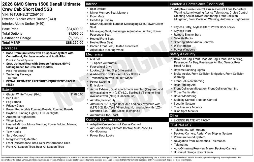 Glacier White Tricoat 2026 GMC Sierra 1500 Denali Ultimate 4WD 10-Speed Automatic EcoTec3 6.2L V8 10-Speed Automatic, 4WD, Alpine Umber Leather. Price includes: $1750 - Buick & GMC Consumer Cash Program. Exp. 03/02/2026 $500 - GM Bonus Cash. Exp. 03/02/2026 $500 - GM First Responder Cash Allowance Program. Exp. 01/04/2027