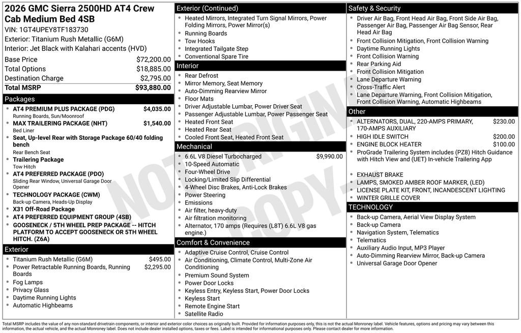 Titanium Rush Metallic 2026 GMC Sierra 2500HD AT4 4WD 10-Speed Automatic Duramax 6.6L V8 Turbodiesel 10-Speed Automatic, 4WD, Jet Black With Kalahari Accents Leather. Price includes: $500 - Buick & GMC Consumer Cash Program. Exp. 03/31/2026 $500 - GM First Responder Cash Allowance Program. Exp. 01/04/2027