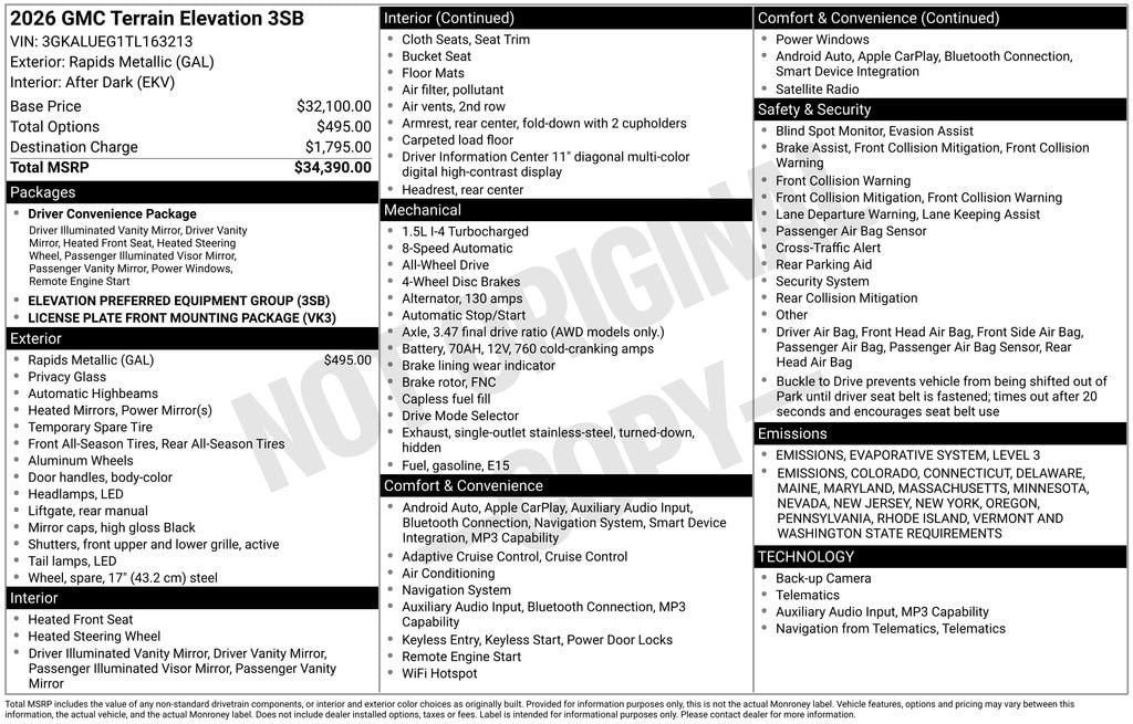 Rapids Metallic 2026 GMC Terrain Elevation AWD 8-Speed Automatic with Overdrive 1.5L DOHC AWD.Recent Arrival! 24/28 City/Highway MPG Price includes: $1000 - Buick GMC Bonus Cash. Exp. 03/02/2026 $500 - GM First Responder Cash Allowance Program. Exp. 01/04/2027