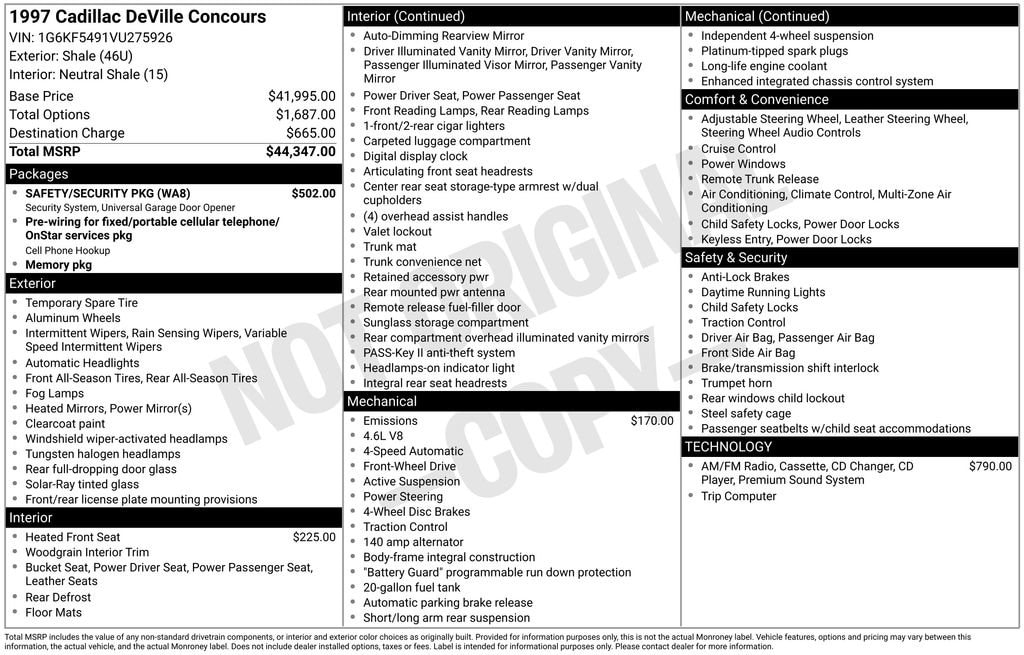 Experience the O'Meara Advantage. OâMeara offers a wide range of vehicles at competitive prices, and our knowledgeable staff is dedicated to helping customers find the perfect car to suit their needs. With over 100 years of experience serving Colorado, we have the expertise and reputation to back up our commitment to excellence and providing the best possible experience for our customers.Recent Arrival! Shale Metallic 1997 Cadillac DeVille Concours Clean CARFAX.LOCAL TRADE, CLEAN CARFAX, NON SMOKER, V8, DeVille Concours, 4D Sedan, 4.6L V8 SMPI, 4-Speed Automatic, FWD, Shale Metallic, Neutral Shale Leather, 11 Speakers, 3-Channel Garage Door Opener, AM Stereo/FM Stereo w/Cass/Seek & Scan, Audible Theft Deterrent System, Electronic Compass, Front dual zone A/C, Fully automatic headlights, Heated Front Seats, Leather Seat Trim, Memory seat, Safety/Security Package, Steering wheel mounted audio controls, Variably intermittent wipers.