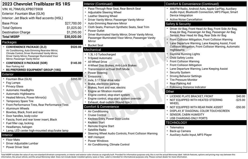 Experience the O'Meara Advantage. OâMeara offers a wide range of vehicles at competitive prices, and our knowledgeable staff is dedicated to helping customers find the perfect car to suit their needs. With over 100 years of experience serving Colorado, we have the expertise and reputation to back up our commitment to excellence and providing the best possible experience for our customers.Recent Arrival! Fountain Blue 2023 Chevrolet TrailBlazer RS CARFAX One-Owner. Clean CARFAX.LOCAL TRADE, CLEAN CARFAX, NON SMOKER, APPLE CARPLAY, ANDROID AUTO, TrailBlazer RS, 4D Sport Utility, 1.3L Ecotec Turbo DOHC SIDI w/VVT, 9-Speed Automatic, AWD, Fountain Blue, Jet Black With Red Accents Cloth, 1 Type-A & 1 Type-C USB Charging-Only Ports, 120-Volt Power Outlet, 6-Speaker Audio System Feature w/Amplifier, 7 Diagonal Color Touchscreen, 8 Diagonal Color Touchscreen Display, Confidence II Package, Convenience Package, Driver & Front Passenger Illuminated Vanity Mirrors, Fully automatic headlights, Heated Steering Wheel, Inside Rear-View Auto-Dimming Mirror, Preferred Equipment Group 1RS, Radio: Chevrolet Infotainment 3 System, Rear Park Assist, Single-Zone Auto Climate Control Air Conditioning, SiriusXM Radio, Steering wheel mounted audio controls, Variably intermittent wipers, Wheels: 18 High Gloss Black Machined Aluminum, Wireless Apple CarPlay/Android Auto.Odometer is 15239 miles below market average! 26/30 City/Highway MPG