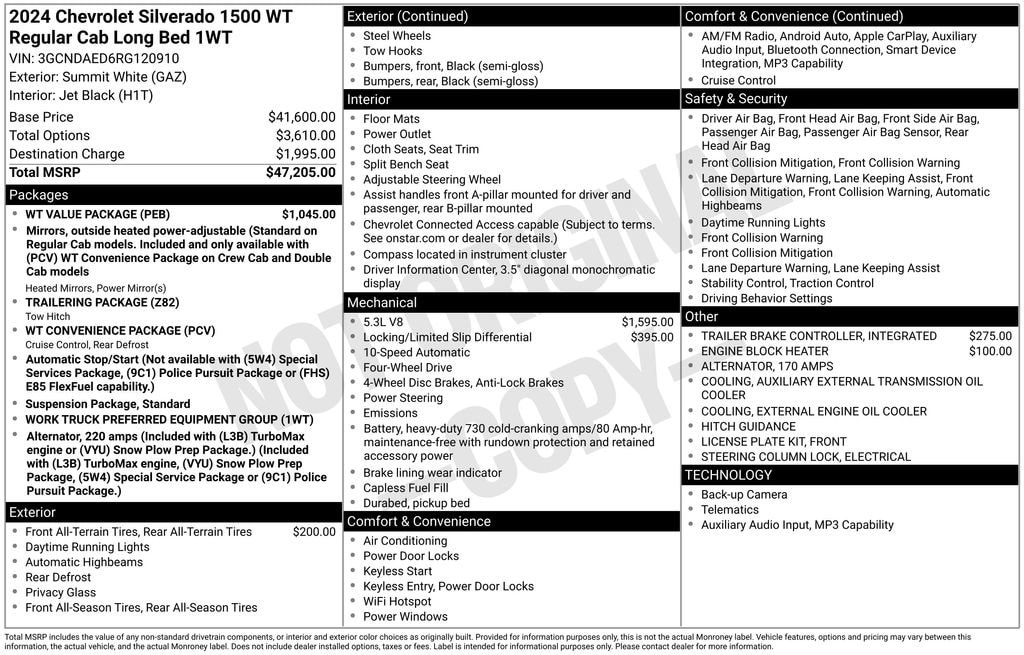 Experience the O'Meara Advantage. OâMeara offers a wide range of vehicles at competitive prices, and our knowledgeable staff is dedicated to helping customers find the perfect car to suit their needs. With over 100 years of experience serving Colorado, we have the expertise and reputation to back up our commitment to excellence and providing the best possible experience for our customers.Recent Arrival! Summit White 2024 Chevrolet Silverado 1500 WT CARFAX One-Owner. Clean CARFAX.CLEAN CARFAX, NON SMOKER, APPLE CARPLAY, ANDROID AUTO, 1 OWNER, Silverado 1500 WT, 2D Standard Cab, EcoTec3 5.3L V8, 10-Speed Automatic, 4WD, Summit White, Black Cloth, 3.5 Monochromatic Display Driver Info Center, Black (Semi-Gloss) Front Bumper, Black (Semi-Gloss) Rear Bumper, Bluetooth® For Phone, Deep-Tinted Glass, Electric Rear-Window Defogger, Electrical Steering Column Lock, Electronic Cruise Control, Front Frame-Mounted Black Recovery Hooks, Fully automatic headlights, HD Rear Vision Camera, Heated Power-Adjustable Outside Mirrors, Hitch Guidance, Inside Rear-View Mirror w/Tilt, Locking Tailgate, Manual Tailgate Function w/No EZ Lift, Manual Tilt Wheel Steering Column, OnStar & Chevrolet Connected Services Capable, Power Front Windows w/Driver Express Up/Down, Power Front Windows w/Passenger Express Down, Preferred Equipment Group 1WT, Premium audio system: Chevrolet Infotainment 3, Remote Keyless Entry, Rubberized-Vinyl Floor Covering, SiriusXM Delete, Solar Absorbing Tinted Glass, Standard Suspension Package, Standard Tailgate, Trailering Package, Variably intermittent wipers, WT Convenience Package, WT Value Package.