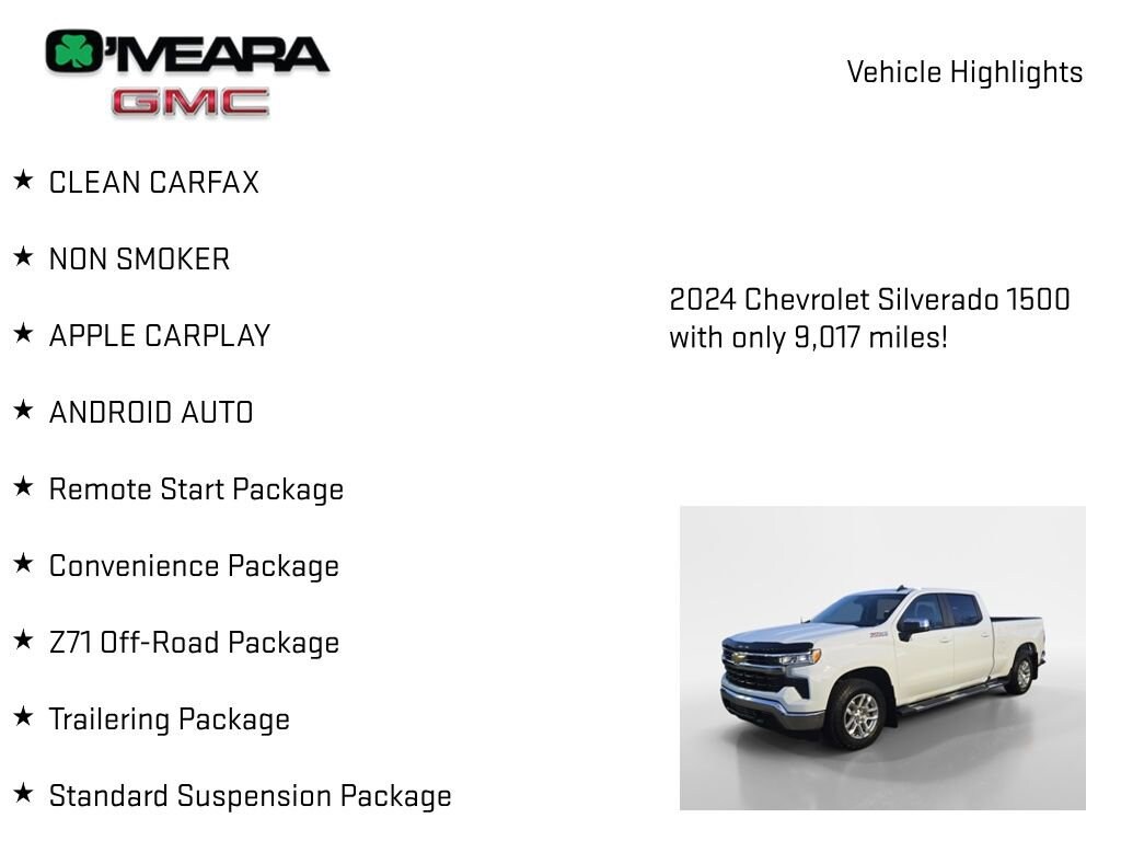 Experience the O'Meara Advantage. OâMeara offers a wide range of vehicles at competitive prices, and our knowledgeable staff is dedicated to helping customers find the perfect car to suit their needs. With over 100 years of experience serving Colorado, we have the expertise and reputation to back up our commitment to excellence and providing the best possible experience for our customers.Recent Arrival! Summit White 2024 Chevrolet Silverado 1500 LT Clean CARFAX.CLEAN CARFAX, NON SMOKER, APPLE CARPLAY, ANDROID AUTO, Silverado 1500 LT, 4D Crew Cab, EcoTec3 5.3L V8, 10-Speed Automatic, 4WD, Summit White, Jet Black w/Cloth Seat Trim, 10-Way Power Driver Seat w/Lumbar, 120-Volt Interior Power Outlet, Convenience Package, Dual Exhaust w/Polished Outlets, Dual Rear USB Ports (Charge Only), Dual-Zone Automatic Climate Control, Front dual zone A/C, Fully automatic headlights, Heated Driver & Front Outboard Passenger Seats, Heated Steering Wheel, Heavy-Duty Air Filter, Hill Descent Control, Hitch Guidance, Keyless Open & Start, Off-Road Suspension, Remote Start Package, Standard Suspension Package, Trailering Package, Variably intermittent wipers, Wheels: 18 x 8.5 Bright Silver Painted Aluminum, Wrapped Steering Wheel, Z71 Off-Road Package.Odometer is 24068 miles below market average!