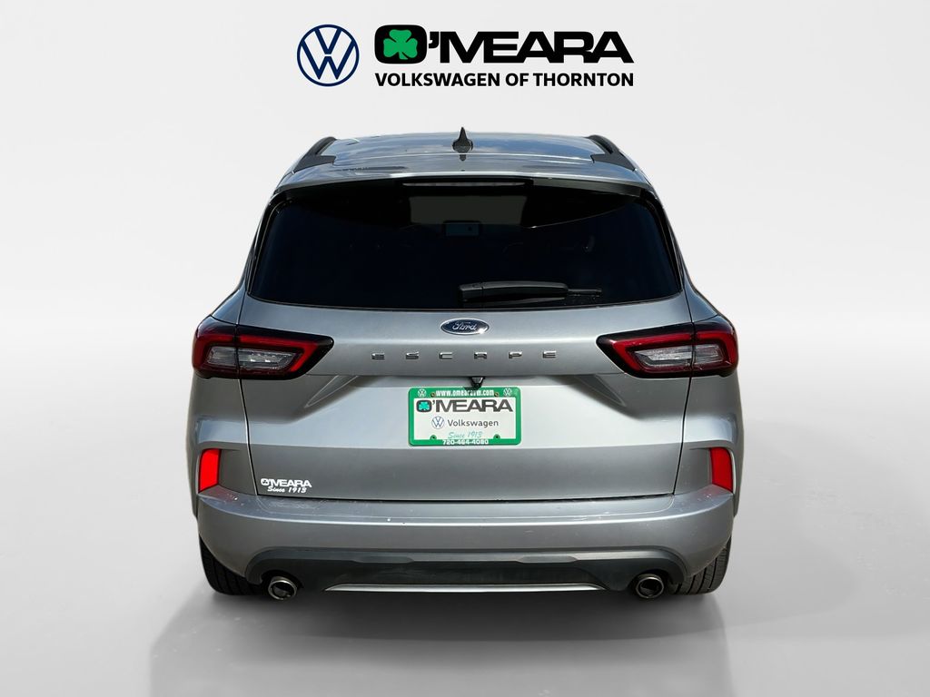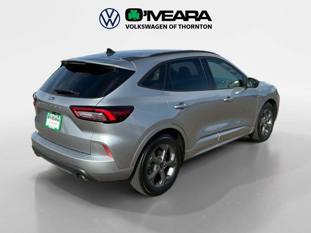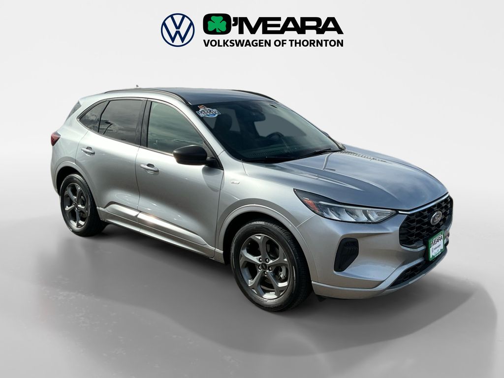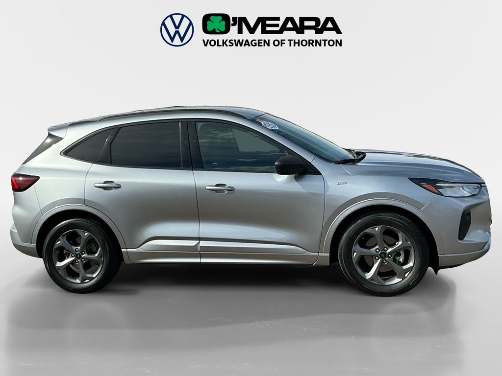 Escape ST-Line, 4D Sport Utility, FWD, Iconic Silver Metallic, Ebony w/Cloth Front Bucket Seats, 3.81 Axle Ratio, 4-Wheel Disc Brakes, 6 Speakers, ABS brakes, Air Conditioning, Alloy wheels, AM/FM radio: SiriusXM, AM/FM Stereo, Auto High-beam Headlights, Automatic temperature control, Brake assist, Bumpers: body-color, Compass, Delay-off headlights, Driver door bin, Driver vanity mirror, Dual front impact airbags, Dual front side impact airbags, Electronic Stability Control, Emergency communication system: SYNC 4 911 Assist, Equipment Group 300A, Exterior Parking Camera Rear, FordPass Connect, Four wheel independent suspension, Front anti-roll bar, Front Bucket Seats, Front Center Armrest, Front dual zone A/C, Front reading lights, Fully automatic headlights, Illuminated entry, Knee airbag, Low tire pressure warning, Occupant sensing airbag, Outside temperature display, Overhead airbag, Overhead console, Panic alarm, Passenger door bin, Passenger vanity mirror, Power door mirrors, Power driver seat, Power Liftgate, Power steering, Power windows, Radio data system, Rear anti-roll bar, Rear reading lights, Rear seat center armrest, Rear window defroster, Rear window wiper, Remote keyless entry, Roof rack: rails only, Speed control, Speed-sensing steering, Speed-Sensitive Wipers, Split folding rear seat, Spoiler, Sport steering wheel, Steering wheel mounted audio controls, SYNC 4, Tachometer, Telescoping steering wheel, Tilt steering wheel, Traction control, Trip computer, Variably intermittent wipers, Vinyl/Cloth Front Sport Contour Bucket Seats, Wheels: 18" Rock Metallic Painted Aluminum.
