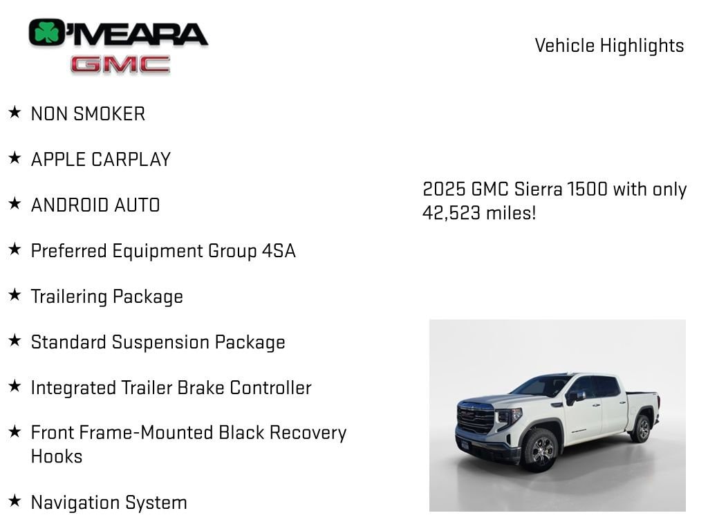 Experience the O'Meara Advantage. OâMeara offers a wide range of vehicles at competitive prices, and our knowledgeable staff is dedicated to helping customers find the perfect car to suit their needs. With over 100 years of experience serving Colorado, we have the expertise and reputation to back up our commitment to excellence and providing the best possible experience for our customers.Summit White 2025 GMC Sierra 1500 SLT CARFAX One-Owner.NON SMOKER, APPLE CARPLAY, ANDROID AUTO, Sierra 1500 SLT, 4D Crew Cab, EcoTec3 5.3L V8, 10-Speed Automatic, 4WD, Summit White, Black Leather, 120-Volt Interior Power Outlet, 170 Amp Alternator, 2 Charge/Data USB Ports, 2 Type-C Charge-Only Rear USB Ports, 6-Speaker Audio System Feature, Auto-Locking Rear Differential, Automatic temperature control, Auxiliary External Transmission Oil Cooler, Chrome Header & Chrome Grille Insert Bars, Color-Keyed Carpeting Floor Covering, Deep-Tinted Glass, Electric Rear-Window Defogger, Front dual zone A/C, Front Frame-Mounted Black Recovery Hooks, Front Rain-Sensing Wipers, HD Rear Vision Camera, Integrated Trailer Brake Controller, Keyless Open & Start, LED Cargo Area Lighting, Manual Tilt-Wheel & Telescoping Steering Column, Navigation System, OnStar Services Capable, Perimeter Lighting, Power Door Locks, Power Front Passenger Windows w/Express Up/Down, Power Front Windows w/Driver Express Up/Down, Power Rear Windows w/Express Down, Preferred Equipment Group 4SA, Push Button Start, Rear Wheelhouse Liners, Remote Vehicle Starter System, SiriusXM w/360L Trial Subscription, Standard Suspension Package, Steering Wheel Audio Controls, Theft Deterrent System (Unauthorized Entry), Trailering Package, Wi-Fi Hotspot Capable.
