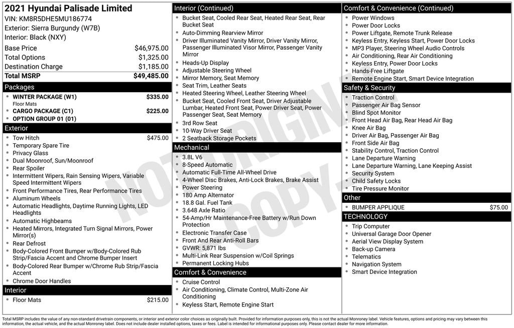 NON SMOKER, APPLE CARPLAY, ANDROID AUTO, Palisade Limited, 4D Sport Utility, V6, 8-Speed Automatic with SHIFTRONIC, AWD, Sierra Burgundy, Black Leather, All-Season Fitted Liners, Cargo Block, Cargo Net, Cargo Package, Cargo Tray, Heads-Up Display, Memory seat, Mudguards, Navigation System, Option Group 01, Power Liftgate, Power moonroof, Rain sensing wipers, Winter Package.