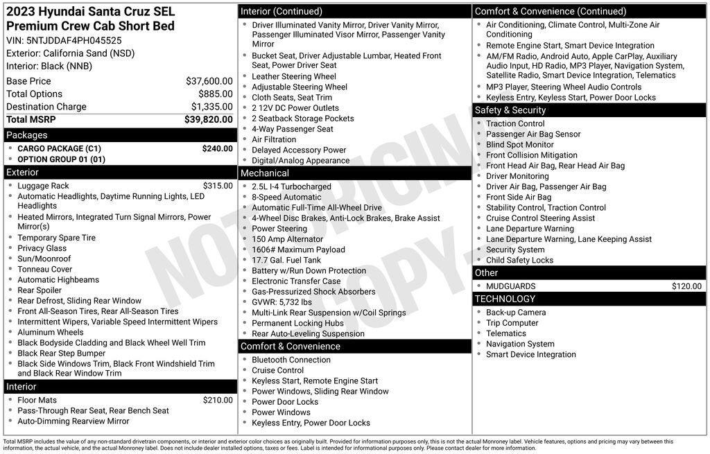 Experience the O'Meara Advantage. OâMeara offers a wide range of vehicles at competitive prices, and our knowledgeable staff is dedicated to helping customers find the perfect car to suit their needs. With over 100 years of experience serving Colorado, we have the expertise and reputation to back up our commitment to excellence and providing the best possible experience for our customers.Recent Arrival! California Sand 2023 Hyundai Santa Cruz SEL Premium Clean CARFAX.19/27 City/Highway MPG