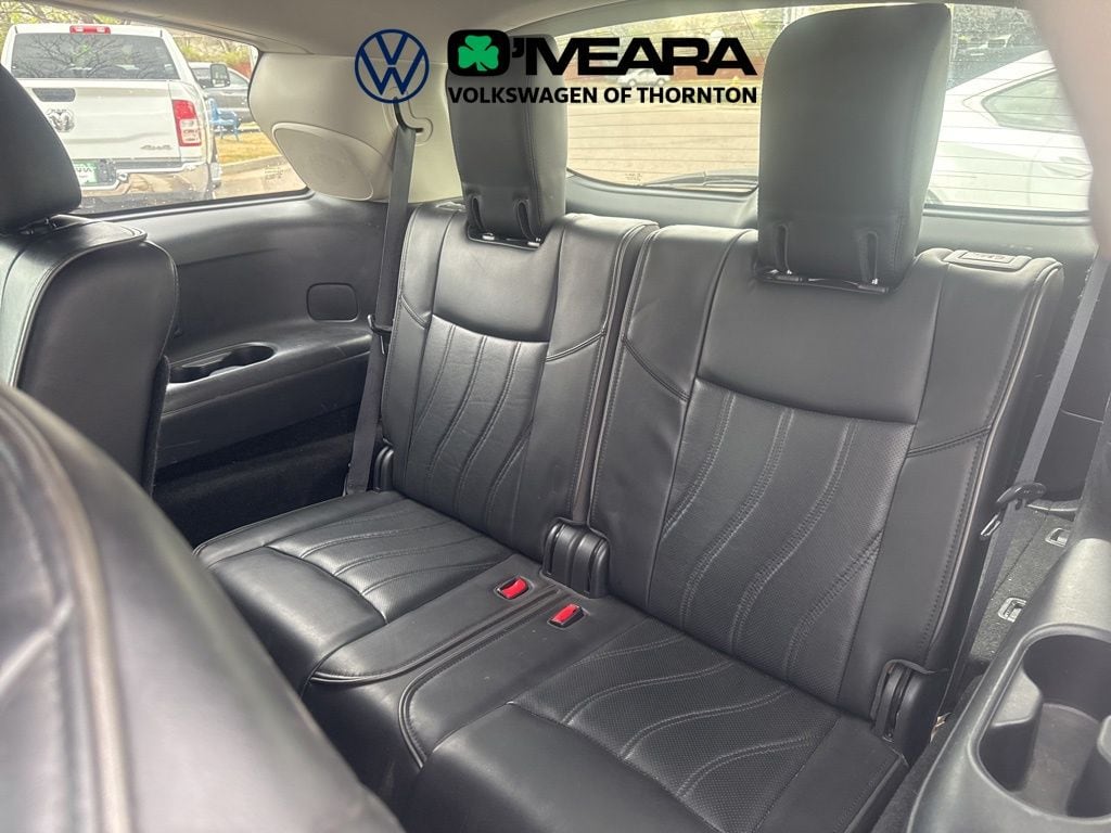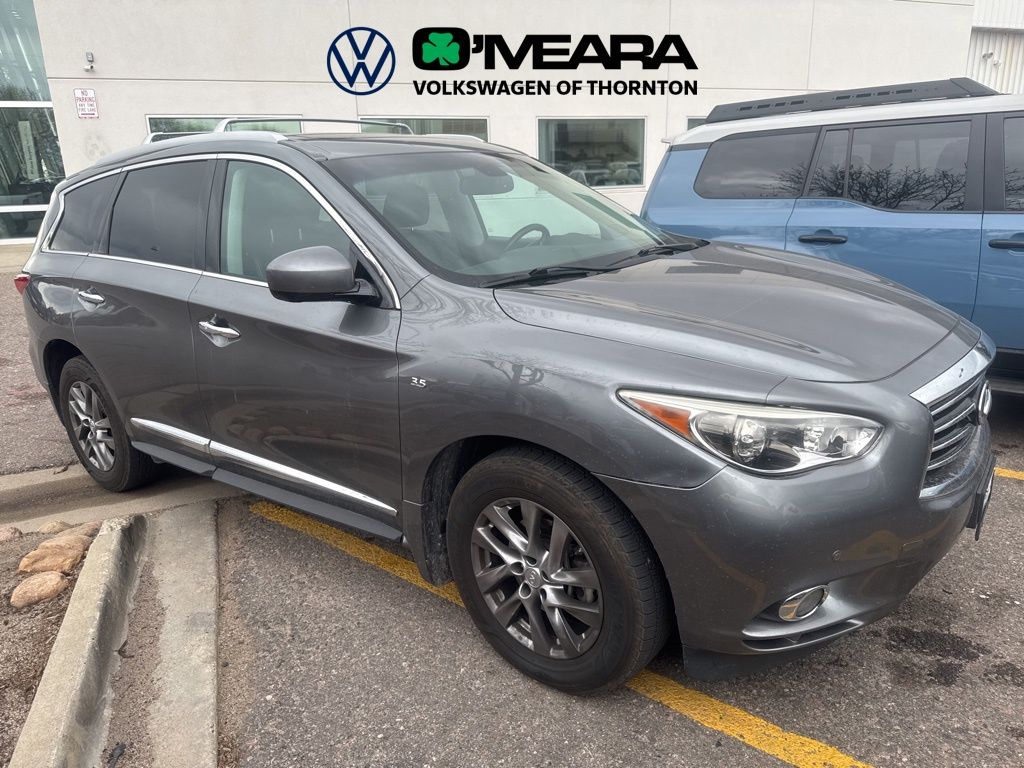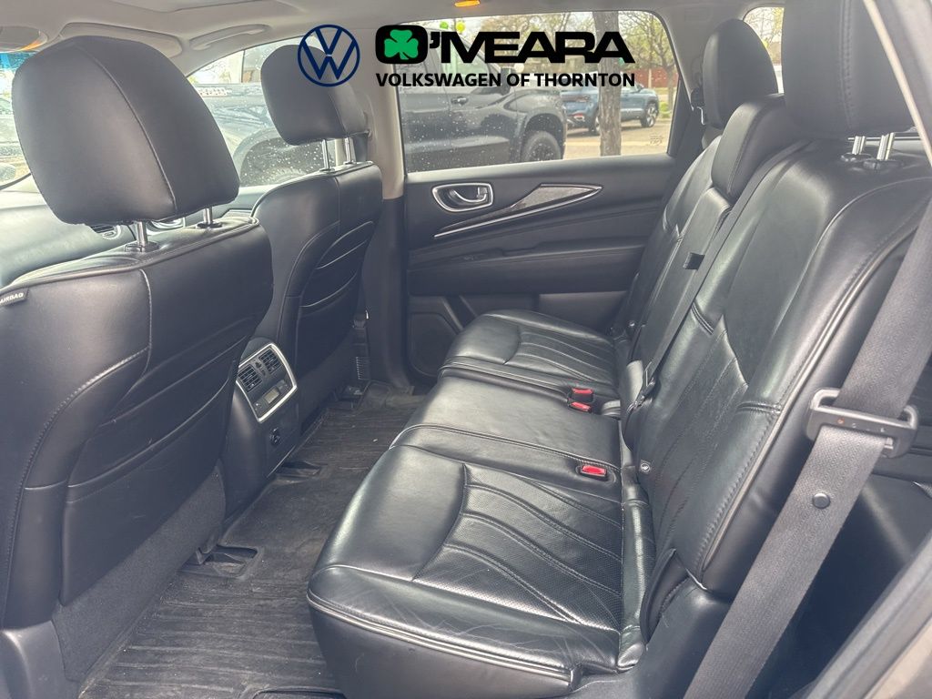 4D Sport Utility, 3.5L V6, Sport-Tuned CVT, AWD, Graphite Shadow, Graphite Leather, 18" 5-Spoke Aluminum Alloy Wheels, 2-Way Driver's Seat Power Lumbar Support, 3rd row seats: bench, 4-Wheel Disc Brakes, 5.17 Axle Ratio, 6 Speakers, ABS brakes, Activation Disclaimer, Air Conditioning, Alloy wheels, AM/FM radio: SiriusXM, AM/FM/CD/MP3 Audio System, Around View Monitor w/Front & Rear Sonar System, Auto-dimming Rear-View mirror, Automatic temperature control, Bodyside moldings, Brake assist, Bumpers: body-color, CD player, Delay-off headlights, Driver door bin, Driver vanity mirror, Dual front impact airbags, Dual front side impact airbags, Dual Occupant Memory System, Electronic Stability Control, Enhanced Intelligent Key Memory, Entry & Exit Assist, Floor Mats, Four wheel independent suspension, Front anti-roll bar, Front Bucket Seats, Front Center Armrest w/Storage, Front dual zone A/C, Front fog lights, Front reading lights, Fully automatic headlights, Garage door transmitter, Heated door mirrors, Heated Front Seats, Heated front seats, Heated Steering Wheel, High intensity discharge headlights: Bi-Xenon, Illuminated entry, Illuminated Kick Plates, Illuminated Kick Plates (PIO), INFINITI Navigation System, INFINITI Voice Recognition, Leather Shift Knob, Leather steering wheel, Leather-Appointed Seats, Literature Kit, Low tire pressure warning, Occupant sensing airbag, Outside Mirrors w/Reverse Tilt-Down Feature, Outside temperature display, Overhead airbag, Overhead console, Panic alarm, Passenger door bin, Passenger vanity mirror, Power door mirrors, Power driver seat, Power Liftgate, Power moonroof, Power passenger seat, Power steering, Power windows, Premium Package, Premium Plus Package, Radio data system, Radio: AM/FM/CD/DVD w/MP3 Playback Capability, Rain-Sensing Front Windshield Wipers, Rear air conditioning, Rear anti-roll bar, Rear Bumper Protector, Rear reading lights, Rear seat center armrest, Rear window defroster, Rear window wiper, Reclining 3rd row seat, Remote Engine Start, Remote keyless entry, Roof Rail Cross Bars, Roof Rails, Security system, Single In-Dash CD Player, Speed control, Speed-sensing steering, Speed-Sensitive Wipers, Splash Guards (Color-Matched Set of 4), Split folding rear seat, Spoiler, Steering wheel mounted audio controls, Tachometer, Telescoping steering wheel, Tilt steering wheel, Traction control, Trip computer, Variably intermittent wipers.