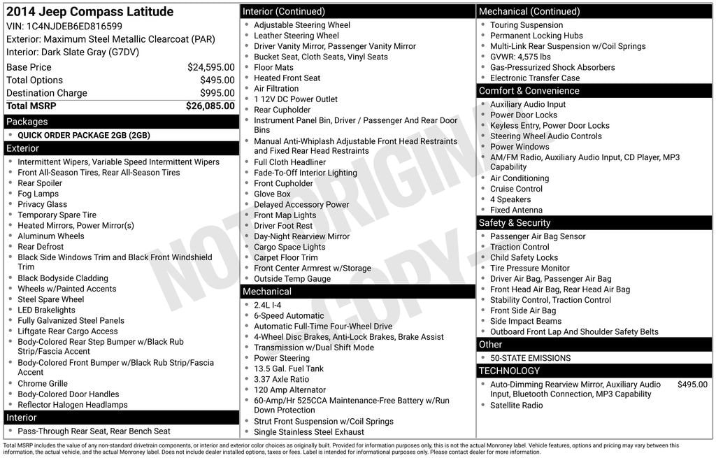 Experience the O'Meara Advantage. OâMeara offers a wide range of vehicles at competitive prices, and our knowledgeable staff is dedicated to helping customers find the perfect car to suit their needs. With over 100 years of experience serving Colorado, we have the expertise and reputation to back up our commitment to excellence and providing the best possible experience for our customers.Recent Arrival! Maximum Steel Metallic Clearcoat 2014 Jeep Compass Latitude CARFAX One-Owner. Clean CARFAX.CLEAN CARFAX, NON SMOKER, APPLE CARPLAY, ANDROID AUTO, 1 OWNER, Compass Latitude, 4D Sport Utility, 2.4L I4 DOHC 16V Dual VVT, 6-Speed Automatic, 4WD, Maximum Steel Metallic Clearcoat, Gray Cloth, Quick Order Package 2GB, Radio: Uconnect 130 AM/FM/CD/MP3, Steering wheel mounted audio controls.Odometer is 79029 miles below market average! 21/27 City/Highway MPGReviews:* If youâre looking for a compact and fuel-efficient small SUV with rugged looks, passable off-road credentials and a number of unique features not found on the competition, the 2014 Jeep Compass may just pull you in. Source: KBB.com* Comfortable front seats; a few clever features; reasonably capable off-road when properly equipped. Source: Edmunds