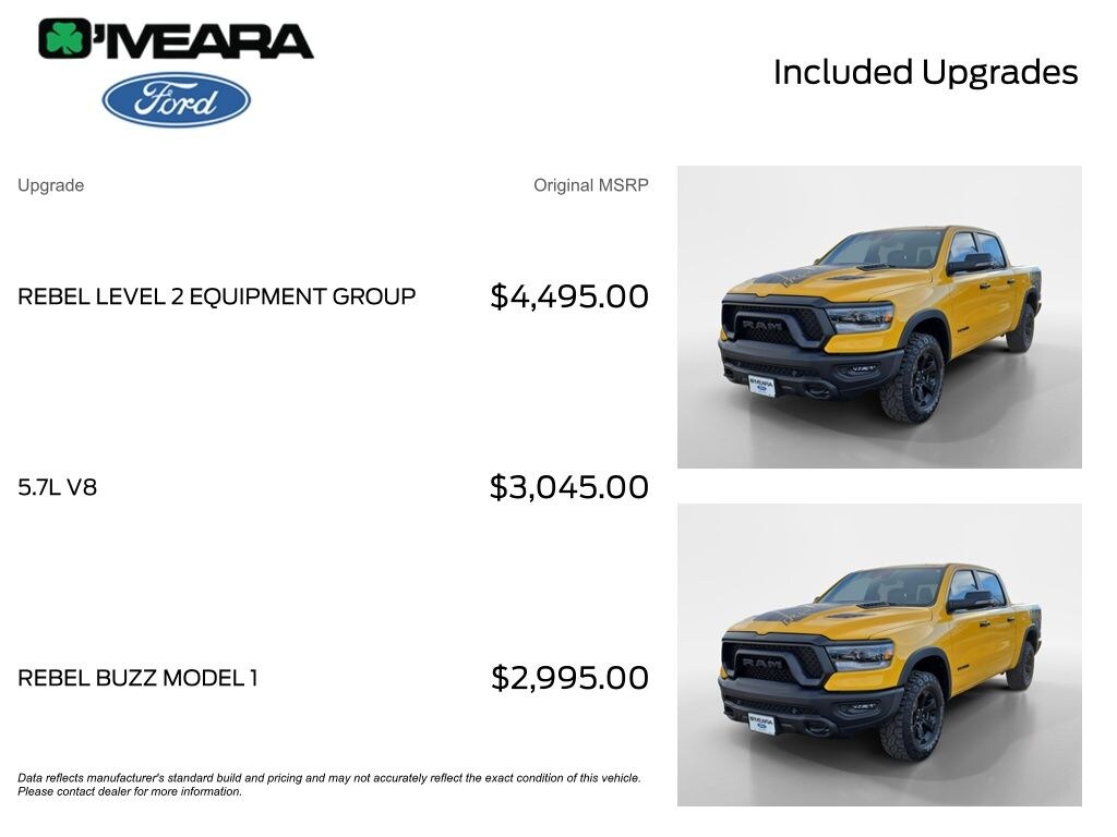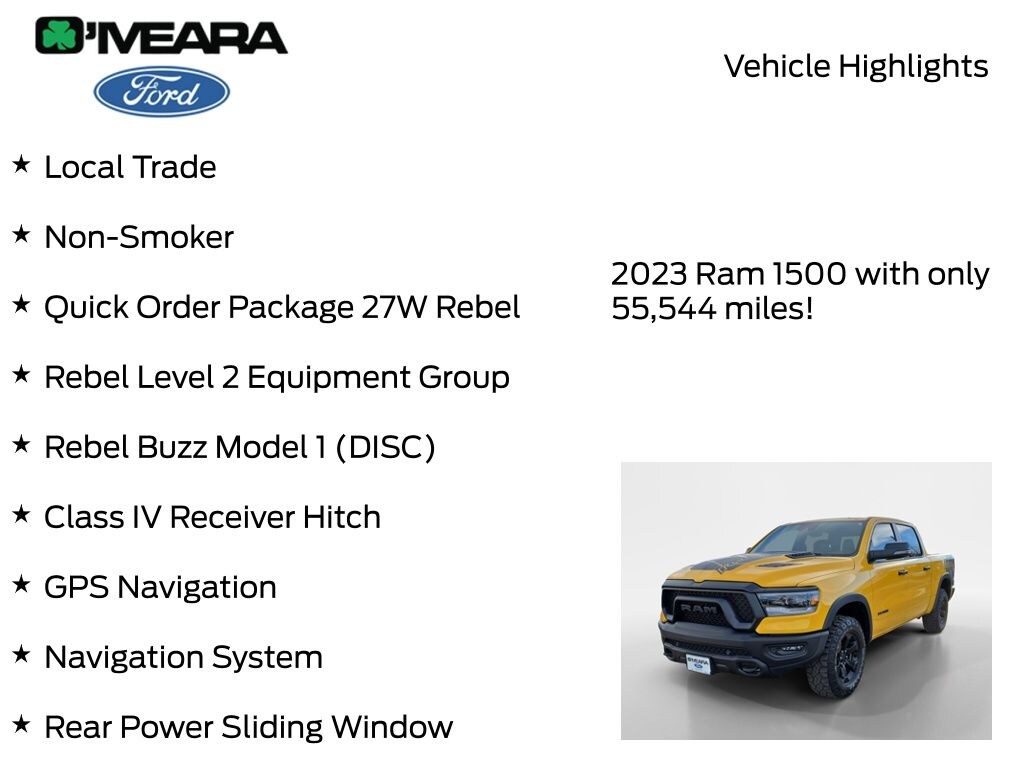 Recent Arrival! CARFAX One-Owner. Baja Yellow Clearcoat 2023 Ram 1500 Rebel 4WD 8-Speed Automatic HEMI 5.7L V8 Multi Displacement VVT eTorque Local Trade, Non-Smoker, 115V Auxiliary Rear Power Outlet, 12" Touchscreen Display, 2-Door Passive Entry, Front Door Locks, 2nd Row In Floor Storage Bins, 4G LTE Wi-Fi Hot Spot, 6 Speakers, Accent Color Door Handles, Apple CarPlay/Android Auto, Auto-Dimming Exterior Driver Mirror, Automatic temperature control, Black Exterior Mirrors, Black Front Bumper w/Black Plate, Black Premium Power Mirrors, Class IV Receiver Hitch, Connected Travel & Traffic Services, Connectivity - US/Canada, Convex Wide-Angle Exterior Mirror Insert, Disassociated Touchscreen Display, Exterior Mirrors Courtesy Lamps, Exterior Mirrors w/Heating Element, Exterior Mirrors w/Supplemental Signals, Foam Bottle Insert (Door Trim Panel), For Details, Visit DriveUconnect.com, For More Info, Call 800-643-2112, Front dual zone A/C, Global Telematics Box Module (TBM), Google Android Auto, GPS Antenna Input, GPS Navigation, Grille Surround 2 Black Texture 3 Black, harman/kardon 19 Speaker Premium Sound, HD Radio, Heated Front Seats, Heated Steering Wheel, Illuminated entry, Integrated Center Stack Radio, Integrated Voice Command w/Bluetooth, Lux Leather Trimmed Bucket Seats, Media Hub w/2 Charge Only USBs, MOPAR Rebel Exterior Side Graphics, MOPAR Rebel Hood Decal, Navigation System, Off-Road Information Pages, ParkSense Front/Rear Park Assist w/Stop, Power 2-Way Driver Lumbar Adjust, Power 8-Way Driver Seat, Power Adjustable Pedals, Power-Folding Mirrors, Quick Order Package 27W Rebel, Radio: Uconnect 5 Nav w/12.0" Display, Rain Sensitive Windshield Wipers, RAM Grille Badge - Black, Rear Dome w/On/Off Switch Lamp, Rear Power Sliding Window, Rear Underseat Compartment Storage, Rear Window Defroster, Rebel Buzz Model 1 (DISC), Rebel Level 2 Equipment Group, Remote keyless entry, Remote Start System, Security Alarm, SiriusXM Radio Service, SiriusXM w/360L, Sun Visors w/Illuminated Vanity Mirrors, Tachometer, Telescoping steering wheel, Tilt steering wheel, Trip computer, Universal Garage Door Opener, USB Host Flip, Voltmeter, Wheels: 18" x 8.0" Gloss Black.