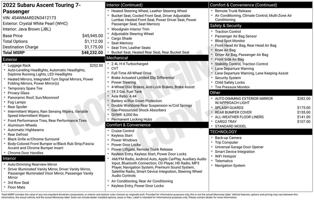 Experience the O'Meara Advantage. OâMeara offers a wide range of vehicles at competitive prices, and our knowledgeable staff is dedicated to helping customers find the perfect car to suit their needs. With over 100 years of experience serving Colorado, we have the expertise and reputation to back up our commitment to excellence and providing the best possible experience for our customers.Recent Arrival! Crystal White Pearl 2022 Subaru Ascent Touring CARFAX One-Owner. Clean CARFAX.CLEAN CARFAX, NON SMOKER, APPLE CARPLAY, ANDROID AUTO, Ascent Touring, 4D Sport Utility, 2.4L 4-Cylinder DOHC 16V, Lineartronic CVT, AWD, Crystal White Pearl, Java Leather, Auto-Dimming Exterior Mirror w/Approach Light, Exterior Parking Camera Rear, Front dual zone A/C, Fully automatic headlights, Navigation System, Power Liftgate, Power moonroof, Radio: Subaru STARLINK 8.0 Multimedia Nav System, Standard Model, Steering wheel mounted audio controls, Variably intermittent wipers.20/26 City/Highway MPG