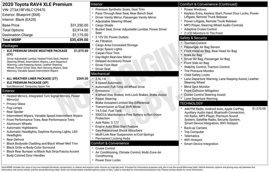 Experience the O'Meara Advantage. OâMeara offers a wide range of vehicles at competitive prices, and our knowledgeable staff is dedicated to helping customers find the perfect car to suit their needs. With over 100 years of experience serving Colorado, we have the expertise and reputation to back up our commitment to excellence and providing the best possible experience for our customers.Recent Arrival! Blue 2020 Toyota RAV4 XLE PremiumCLEAN CARFAX, NON SMOKER, APPLE CARPLAY, ANDROID AUTO, RAV4 XLE Premium, 4D Sport Utility, 2.5L 4-Cylinder DOHC Dual VVT-i, 8-Speed Automatic, AWD, Blue, 3 Spoke Leather Heated Steering Wheel, Apple CarPlay/Android Auto, Auto High-beam Headlights, Driver Seat w/2-Position Memory Function, Exterior Parking Camera Rear, Front Door Smart Key System w/Push Button Start, Front dual zone A/C, Front Seat Heating, Power Liftgate, Power moonroof, Rain Sensing Front Wipers, Steering wheel mounted audio controls, Tilt & Slide Moon Roof, Wiper/Windshield Deicer, XLE Premium Grade Weather Package, XLE Premium Package.Odometer is 3841 miles below market average! 27/33 City/Highway MPG