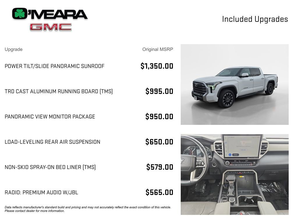 NON SMOKER, APPLE CARPLAY, ANDROID AUTO, JBL AUDIO SYSTEM, Tundra Limited, 4D CrewMax, 3.4L V6, 10-Speed Automatic, 4WD, White, Black w/SofTex Seat Trim, Active Cruise Control, High Grade Full LED Headlamp, Memory seat, Navigation System, Power Tilt/Slide Panoramic Sunroof, Premium Package, Speed control, Towing Package, TRD Cast Aluminum Running Board (TMS).